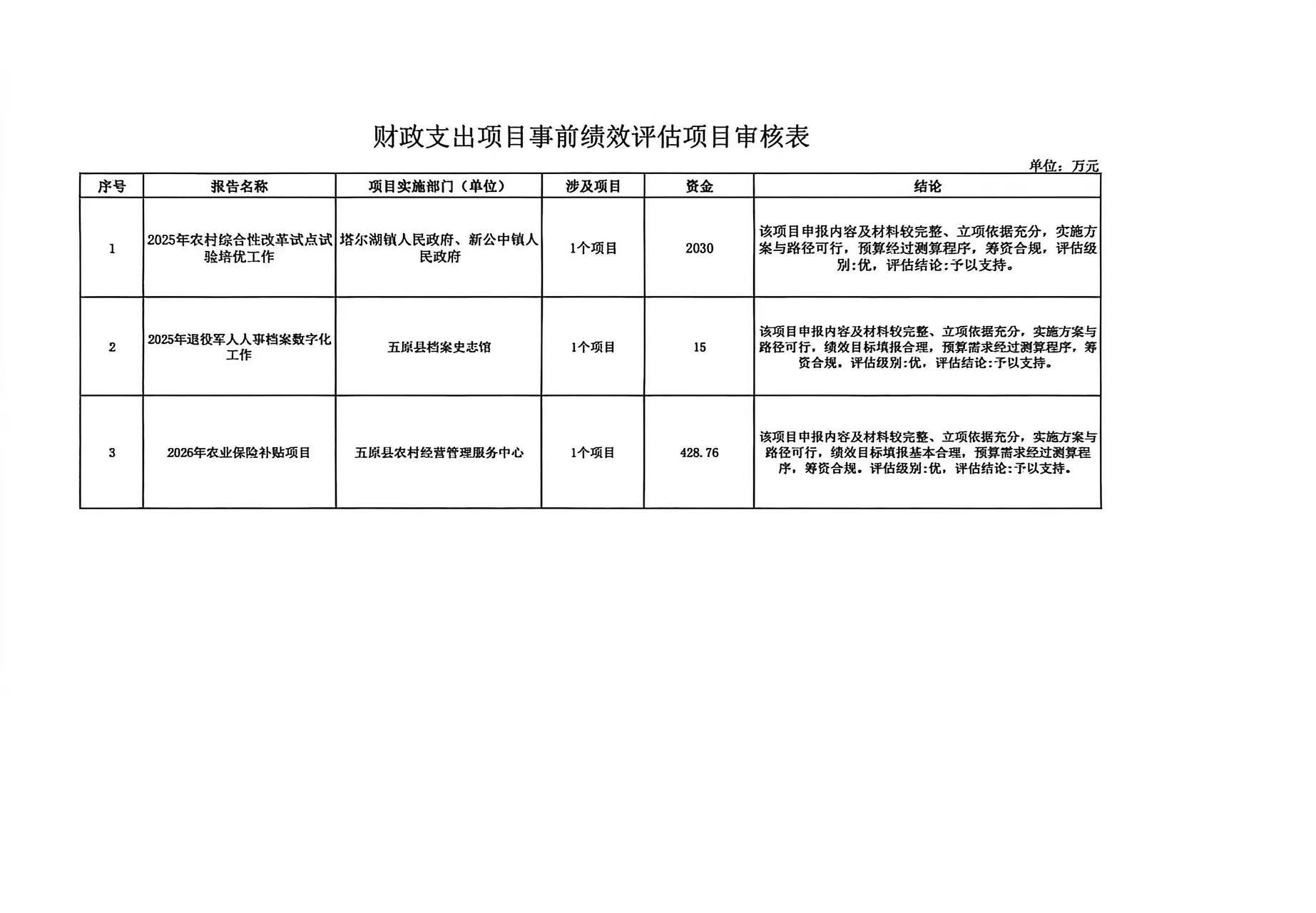 為深入貫徹落實《中共中央、國務院關于全面實施預算績效管理的意見》(中發[2018]34號)和《內蒙古自治區關于全面實施預算績效管理的實施意見》(內財監[2019]1343號)文件精神,根據《中華人民共和國預算法》、《項目支出績效評價管理辦法》(財預[2020]10號)、《內蒙古自治區項目支出績效評價管理辦法》(內政辦發[2021]5號)等相關法規要求,2025年五原縣財政局委托第三方中介機構對我縣3個預算部門的財政支出項目進行了事前績效評估。
