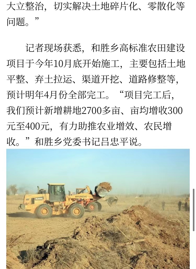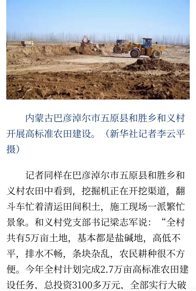 2021年11月30日,新華社刊發題為《讓“花花田”變成高產田——內蒙古冬季高標準農田建設見聞》長篇通訊,用大篇幅文段詳細描寫了五原縣開展高標準農田建設的現場情況和取得成效,對我縣高標準農田建設工作高度贊揚。文章發布后,廣受關注,一天內的瀏覽量高達100.3萬!