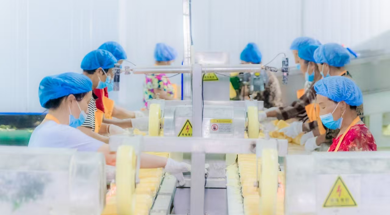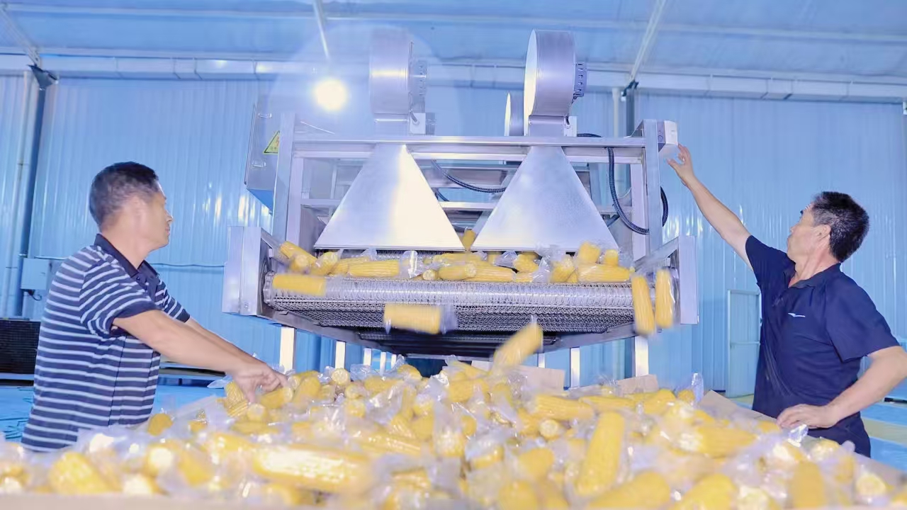 離玉米種植基地不足6、7公里的加工車間里,同樣一片忙碌。剛運(yùn)到的鮮食玉米被立即送進(jìn)分揀區(qū),工人們快速剔除破損、過小的玉米,剩下優(yōu)質(zhì)玉米經(jīng)清洗、切段、殺菌等環(huán)節(jié)后,真空打包、快速處理。從玉米采摘到完成包裝,整個(gè)過程嚴(yán)格控制在60分鐘內(nèi),這就是“一小時(shí)鎖鮮”的核心環(huán)節(jié)。